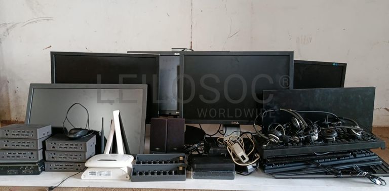 Nove monitores, nove teclados, três auriculares profissionais, seis carregadores, duas um par de colunas para computador, um mouse, dois sistemas de rede WiFi, sete estação de ancoragem universal Targus USB-C, diversos sistemas de colunas de computador Cyber Acoustics CA-2014rb 2.0