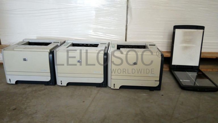 Três impressoras marca hp, modelos P2055dn e um scanner, marca Canon