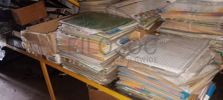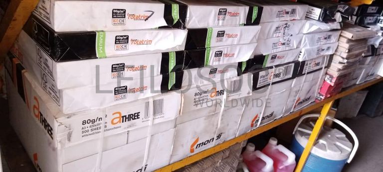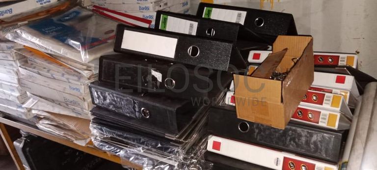 78 blocos de resmas A3 80g/m² 420x297mm, 10 fitas de aço inox 9.53x0.5mmx30m, 3 resmas de papel khaki A3 80gx 500 folhas XEROX, 48 caixinhas com 25 cada pasta BENTEX, cerca de 300 mikas para papel A4, 48 pastas de arquivos A4, 6 rolos de transparent film, 7 caixinhas de MARKER FOR LAUNDRY 0.7mmx12pcs, 2 double-side tape 80um*12mm*10y, cercas de 1500 separadores flamingo ar,
