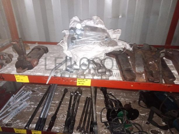 13 Varão roscado, m16, 1 ponta de eixo axor, 2544, 2 handle, 1 Torque Square Wrench, 50-250NM, 5 Cabo de roquete, 2 battery drill, Hit camical Gun, 95 Martelo de andaime, 4 strong Hummerdrive, 10 Martelo de borracha, 5 Copper humer, 22 Martelo Ball Pean Hammer, 3 Tubos para Bomba de Água, 2 Male plug, 1 Concrete drilling Machine, 1 máquina de marca fusion 3