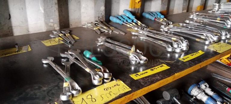 6 chaves boca loneta GEODORE 18mm, 4 chaves boca loneta GEODORE 19mm, 7 chaves boca loneta GEODORE 20mm, 4 chaves boxa 19mm, 8 chaves de rebarbadeiras, 7 chaves boca loneta GEODORE 21mm, 5 chaves boca loneta GEODORE 22mm, 14 chaves boca loneta GEODORE 24mm, 10 limas, 8 chaves boca loneta GEODORE 27mm, 5 chaves boca loneta GEODORE 38mm, 32 chaves boca loneta GEODORE 32mm, 8 chaves boca loneta GEODORE 32mm, 5 chaves boca loneta GEODORE 34mm, 12 chaves boca loneta GEODORE 36mm, 5 chaves boca loneta GEODORE 41mm, 12 chaves boca loneta GEODORE 46mm, 4 chaves boca loneta GEODORE 55mm, 5 chaves de canhão 11mm, 3 chaves de canhão 12mm, 1 5 chaves de canhão 13mm.