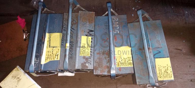 Mala 4( 2 chaves 24, 1 flogging, 1 grampo, 1 grampo, 2 alicate de pressão, 1 pounch, martelo, 1chalk line, 2 chaves 36). + 5 malas metálicas de ferramentas: