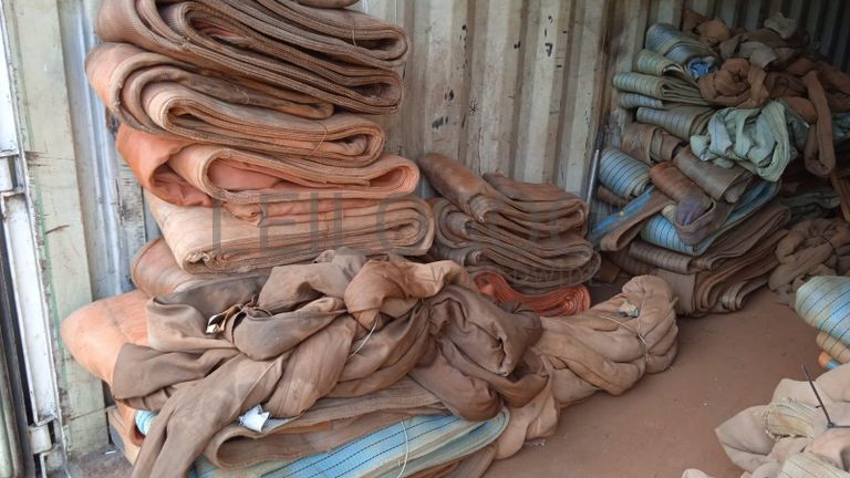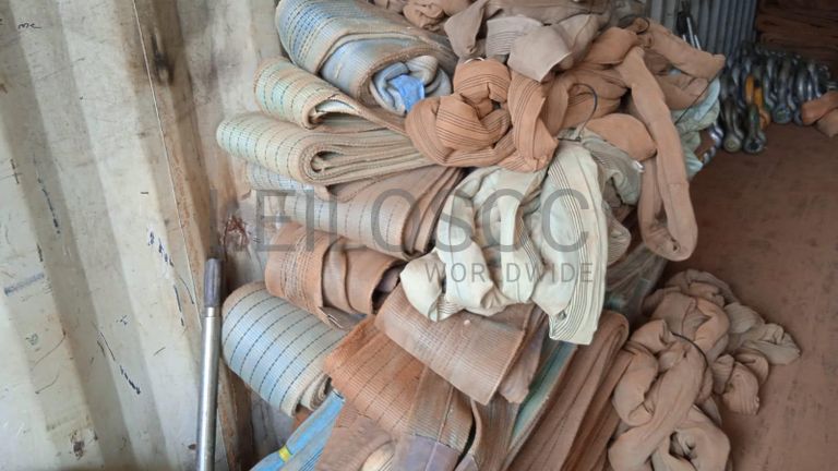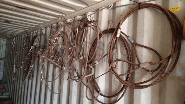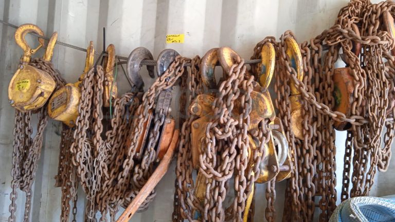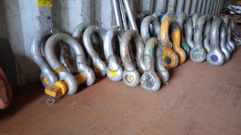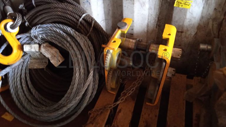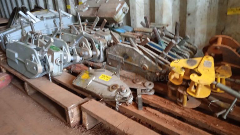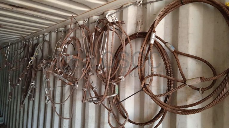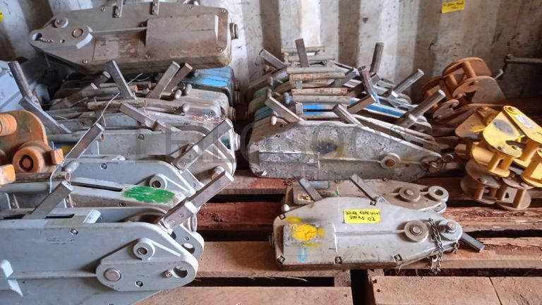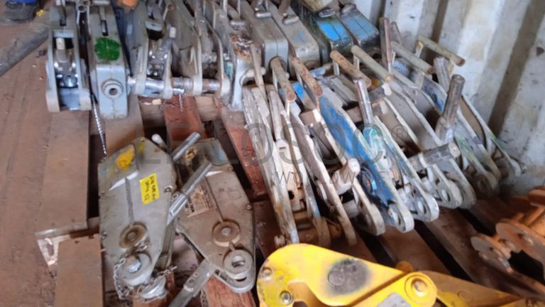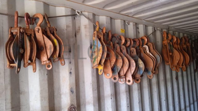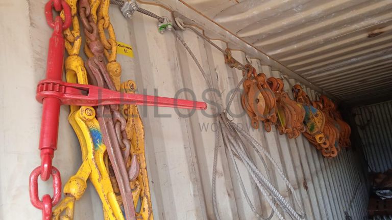 5 Camelon, campacidades 3ton, 9 Chain Block's 3ton, 12 Wire Sling capacidades 1.5ton + 5 Tire-force, capacidades 5.4ton, 3.2ton, 20 Wire Rope, capacidades 5ton, 3ton, 1.6ton, 3 Beam Clamp's, 3ton, 2beam Clamp's, 10ton, 2 Beam Clamp's 3ton, e 1ton. + 25 guinchos, capacidades 5ton, 3ton, 1ton, 5 Tatchet Hooker, capacidades 6ton, 12ton. + 58 Shackles, capacidades, 55ton, 25ton, 25ton, 13ton, 8ton, 1 Opening Jaw, 2 Self Retractwe, 6 cabos cabos de aço. + 16 Sling's 15ton, 8 Sling's 8ton, 23 Sling's 6ton, 10 Sling's 5ton, 20 Sling's 2ton, 6 Sling's 8ton, 20 Sling's 10ton, 12 Sling's 25 Ton, 13 Sling's 15 Ton, 16 Sling's 10 ton, 18 Sling's 16 ton, 1 Sling 65 ton, 5 Sling's 35 Ton. + Um contentor de 40P