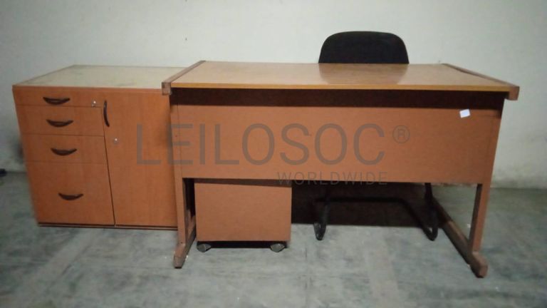 Uma secretária, uma cadeira fixa, um bloco rodado e um armário.