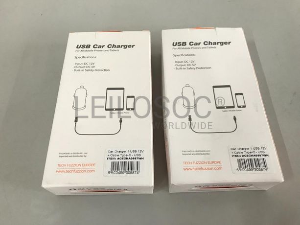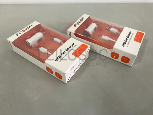 Pack de duas unidades de carregador de isqueiro de 12V para o carro + cabo USB Tipo-C, da marca TECH FUZZION, para carregar telemóveis e tablets. Total 4 peças. Artigo Novo. Nota: não acresce IVA.