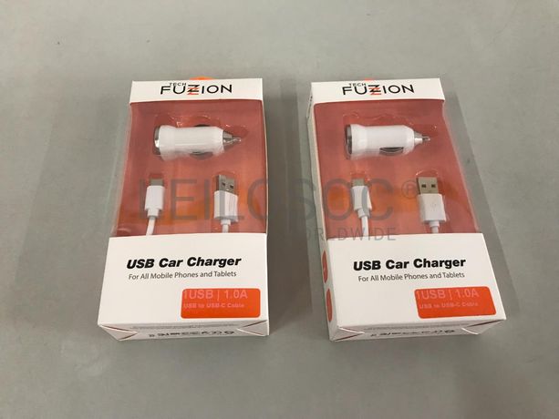 Pack de duas unidades de carregador de isqueiro de 12V para o carro + cabo USB Tipo-C, da marca TECH FUZZION, para carregar telemóveis e tablets. Total 4 peças. Artigo Novo. Nota: não acresce IVA.