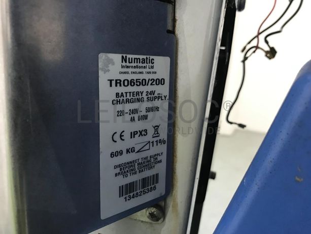 Máquina lavadora Numatic, modelo TRO650/200, de condutor apeado, não tem baterias, n.º de série 134825386. NOTA: Não funciona,