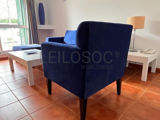 ·Sala Comum - Quadro decorativo, quadro com espelho, aparador de Hall, mesa de jantar branca, 4 cadeiras azuis, telefone Alcatel, candeeiro de teto, sofá-cama azul, puf azul, mesa de apoio, 6 candeeiros de aplique azuis, TV com comando, candeeiro de mesa, mesa de apoio sala, aquecedor, equipamento ar condicionado, varão com cortinados, mobiliário de exterior (1 mesa, 8 cadeiras), jarrão decorativo azul, travessa decorativa azul, balde com esfregona, cinzeiro.