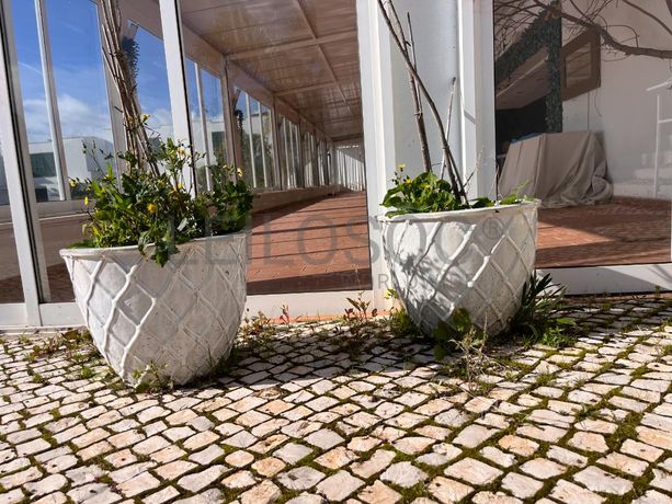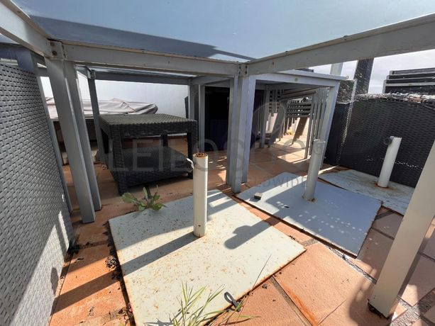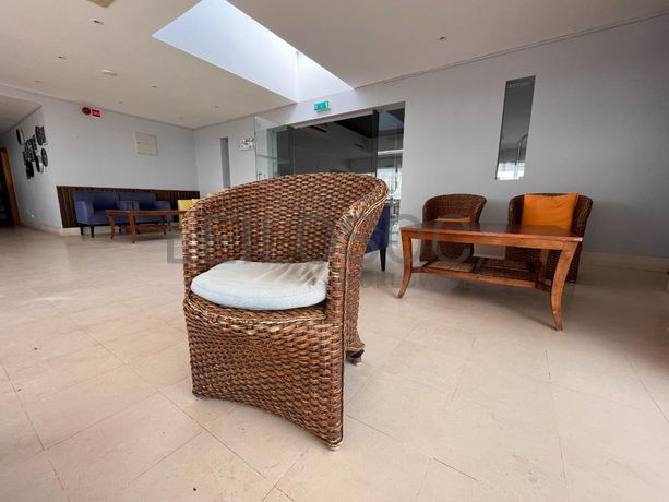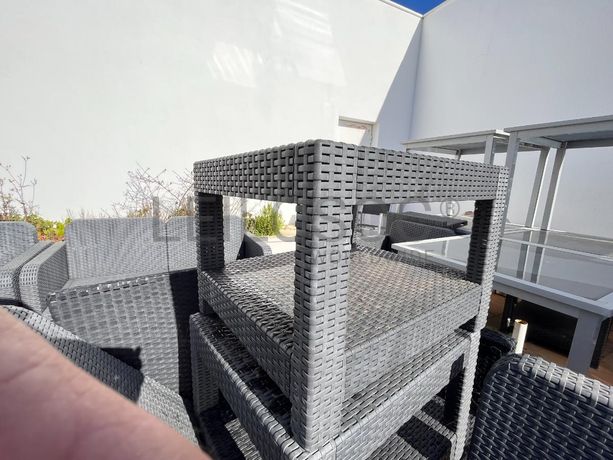 ·Exterior - 4 Sofás de plástico de 2 lugares, 12 cadeirões de plástico individuais, 3 mesas de apoio com tampo de vidro, 3 chapéus de sol grandes, 2 mesas de apoio cinzentas.