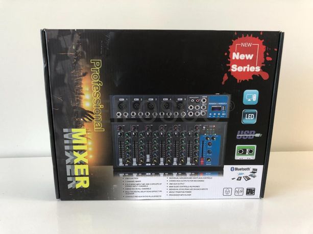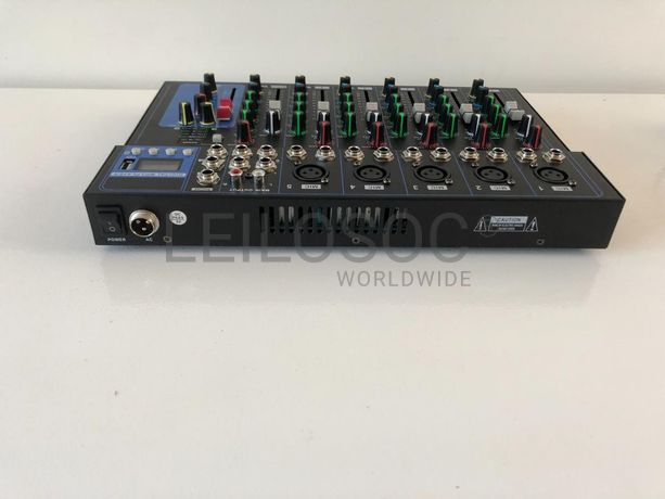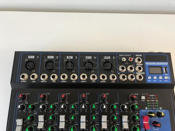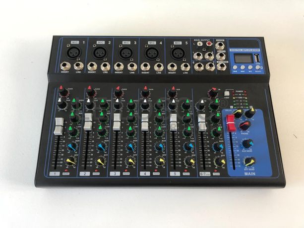 Mesa de mistura de som de 7 canais, com função USB, equalização, ganho individual, Saída AUX, saída de fones, saída master, USB para leitor MP3, ligação Bluetooth. Artigo Novo. Nota: não acresce IVA. (E47)