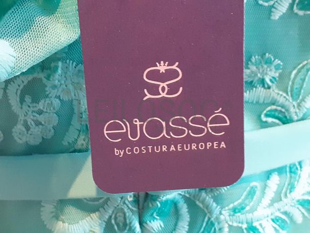 Vestido comprido, com efeito casaquinha, com manga rodada, cintura com efeito cinto com pedras, cor verde, tamanho 40, com cauda, da marca EVASSÉ.