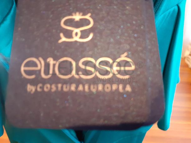 Vestido de cerimónia comprido em cetim, peito trabalhado com pedras, folho na cintura, costas abertas, cor verde, tamanho 36, da marca EVASSÉ. Tem echarpe de cor verde.