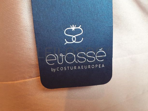 Vestido de cerimónia em cetim, com brilhantes e lantejoulas na parte da frente, cor rosa chá, tamanho 42, marca EVASSÉ.