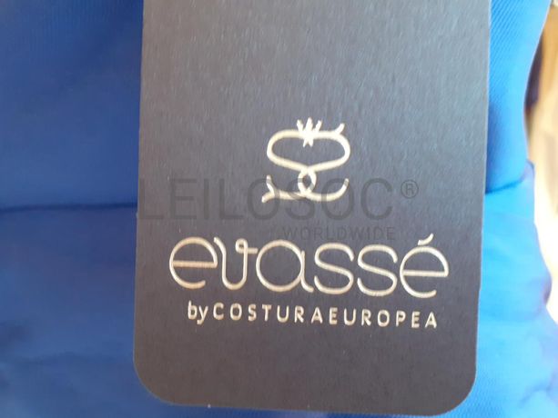 Vestido de cerimónia em cetim, cinto azul com laço, cor azul e riscas na parte inferior, tamanho 42, da marca EVASSÉ.