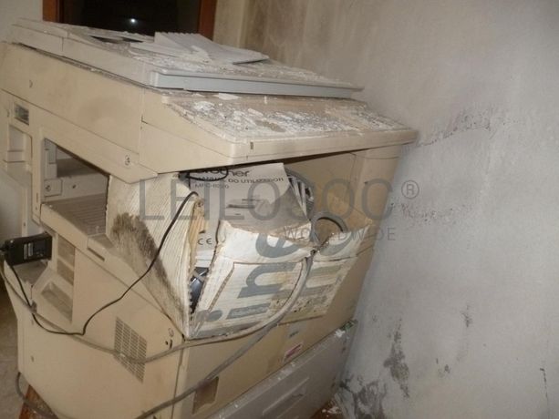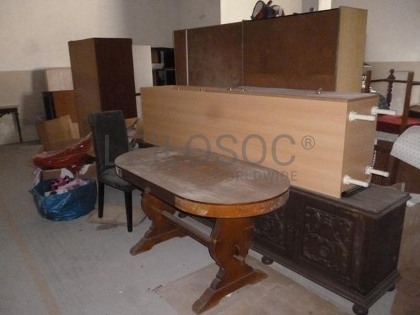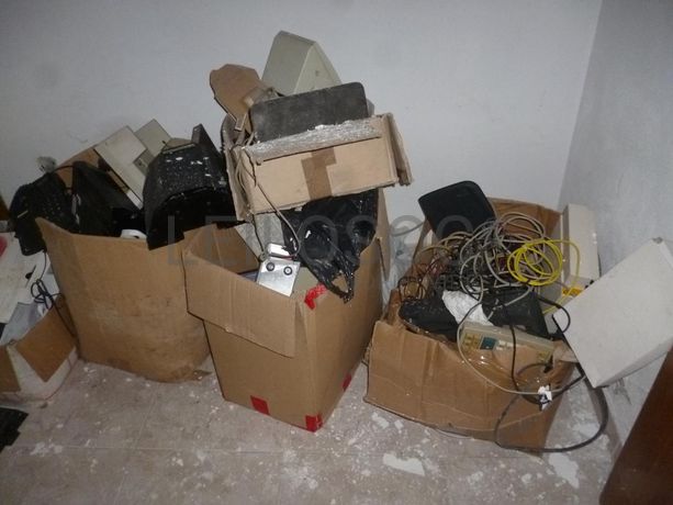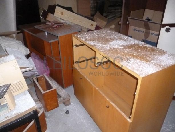 Móvel Branco “Pulser”, 6 estantes brancas, gavetas, 2 mesas castanhas antigas, 6 cadeiras castanhas, mesa castanha antiga, móvel retangular antigo, móvel castanho, 2 móveis castanhos “amarelados”, ¼ de móvel castanho com tampo em granito, estante de cor preta, móvel castanho e branco, impressora Deskjet, 9 cadeiras de madeira almofadadas, mesa com pernas pretas e tampo branco, colchão, gavetas, parte de móveis, caixas de calçado em cartão às riscas (vazias), 2 secretárias com 3 gavetas, cadeira, impressora HP Color Laser Jet 3550, multifunções Enatécnica, impressora Brother, impressora Gestetner 9743, 2 caixas com material informático velho, colchão solteiro.