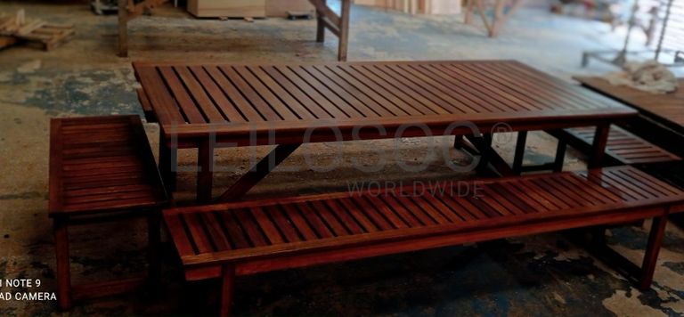 Mesa retangular, de madeira exótica, com cor natural, de dimensões 230 x 105 cm, com estrutura estável resistente e duradoura, de manutenção simples, com 4 bancos. De assento de 40cm. Artigo feito manual e artesanalmente. Nota: não acresce IVA.