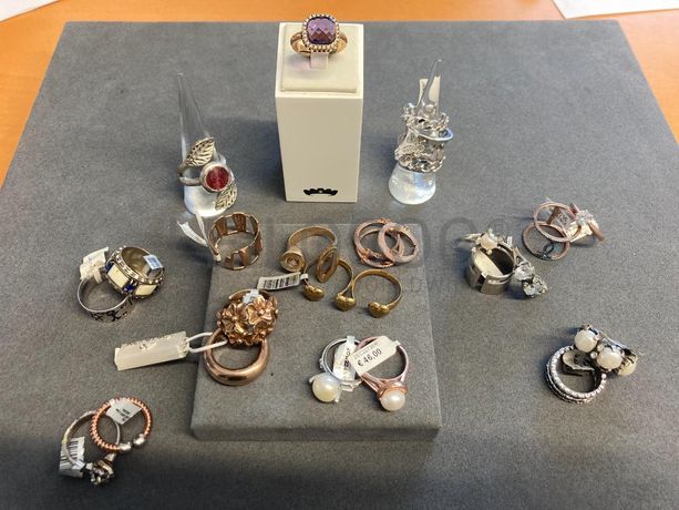 24 Anéis em prata e outros materiais, de várias cores, alguns deles com pérolas e brilhantes.