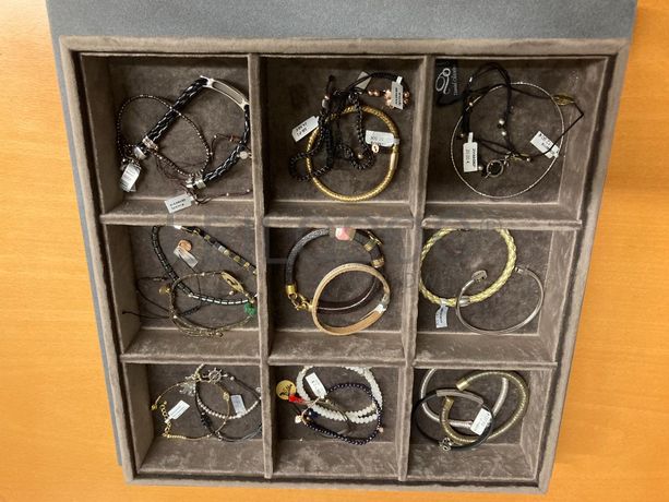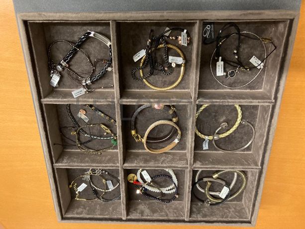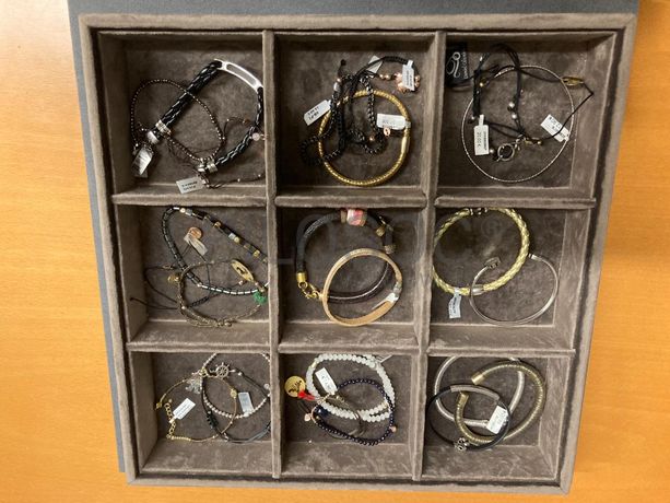 25 Pulseiras em prata e outros materiais, de diversos formatos e cores.