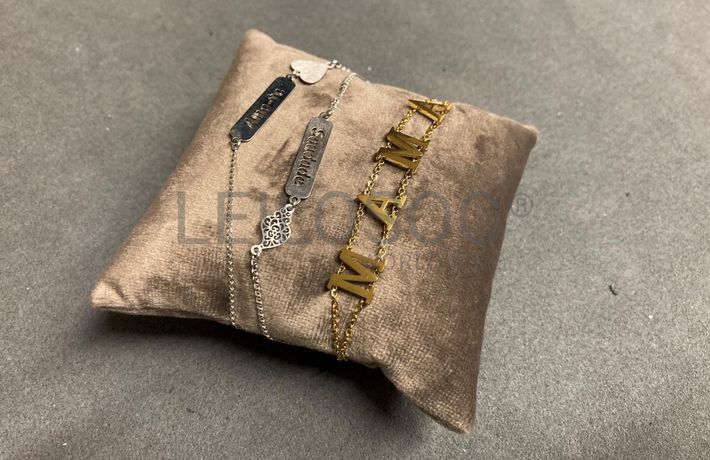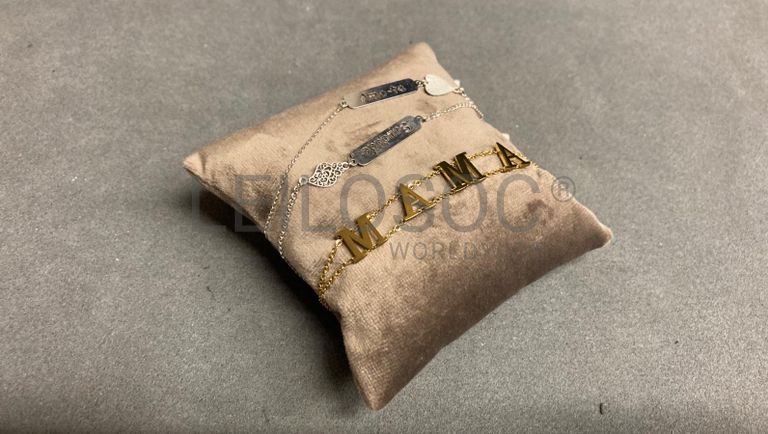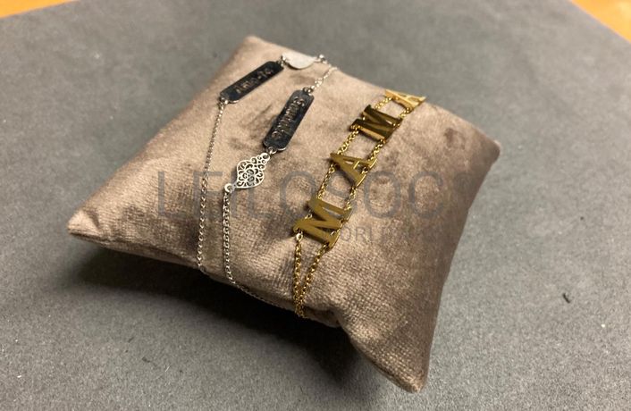 3 Pulseiras em prata e outros materiais, de diversos formatos e cores.