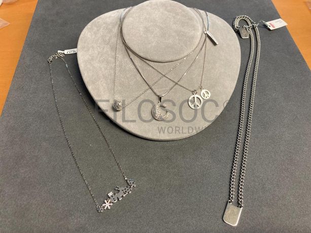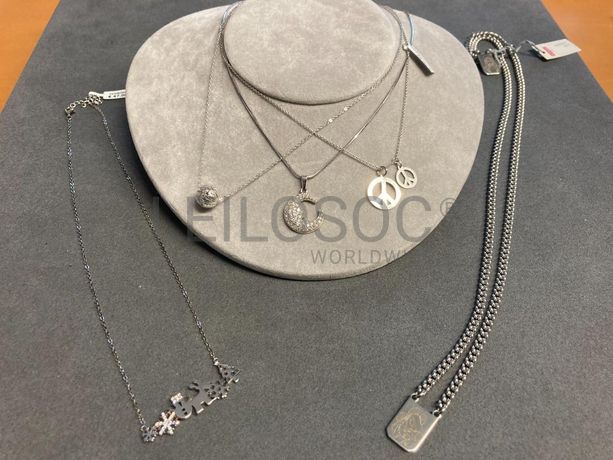 5 Colares em prata e outros materiais, prateados, alguns com brilhantes.