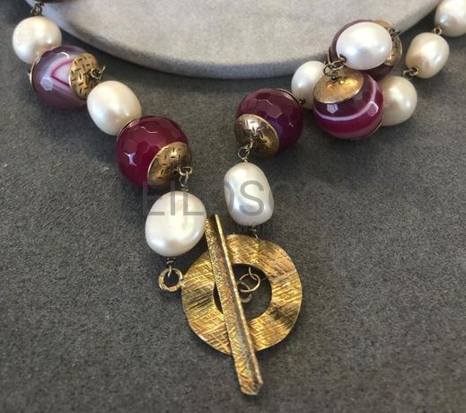 Colar roxo e preto, com pérolas, missangas e pedras.