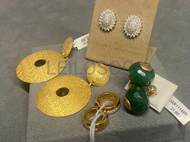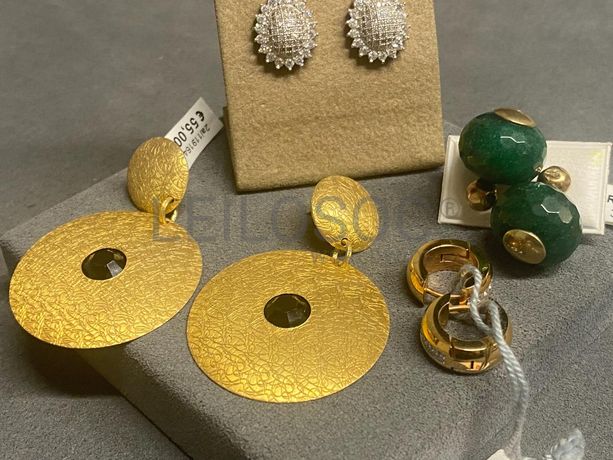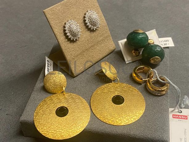 4 Pares de brincos em prata e aço, de diversos formatos e cores.
