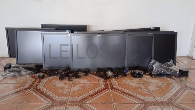 Doze monitores, seis marca Lenovo, seis marca Dell, dois dock stasion, seis cabos de corrente,seis cabos VGA e seis cabos de impressora.