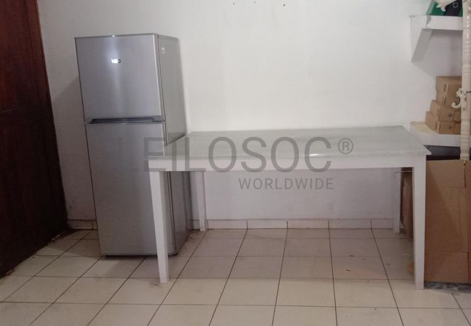 Uma geleira de marca Kic e uma mesa.
