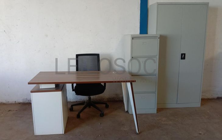 Uma secretária, dois armários metálicos e uma cadeira giratória.