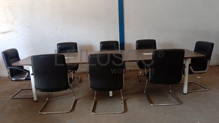 Uma mesa de reuniões e oito cadeiras fixas.