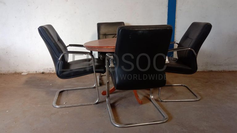 Uma mesa redonda e quatro cadeiras fixas.