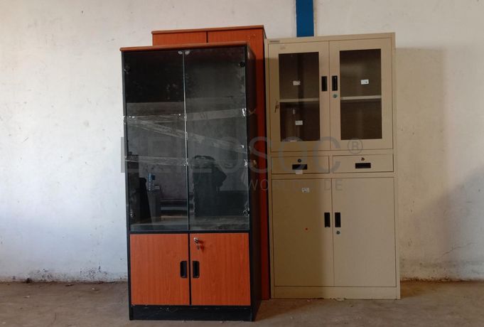 Dois armários de madeira e um metálico.