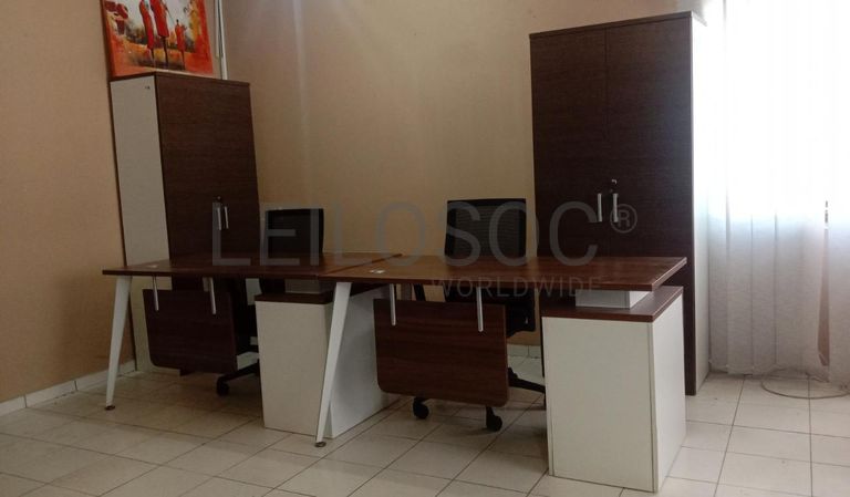 Duas secretárias, dois armários, dois blocos rodados e duas cadeiras giratórias.