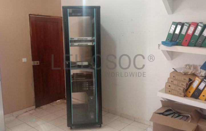 Um rack, um servidor de marca Dell, três switch, três routers e um ups de marca evolution.