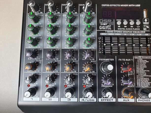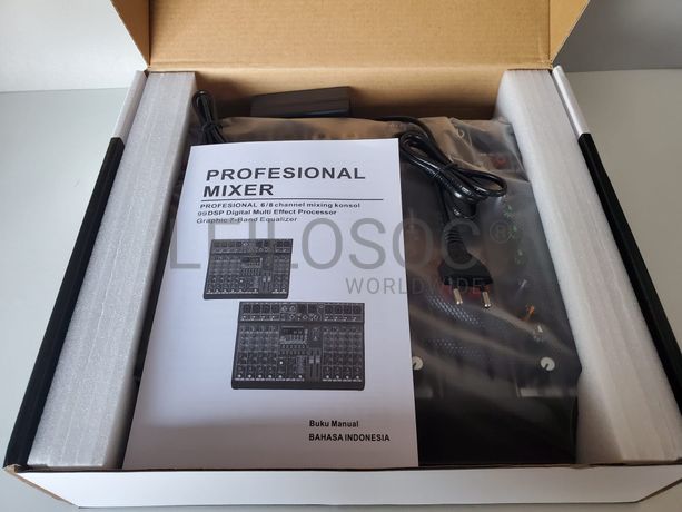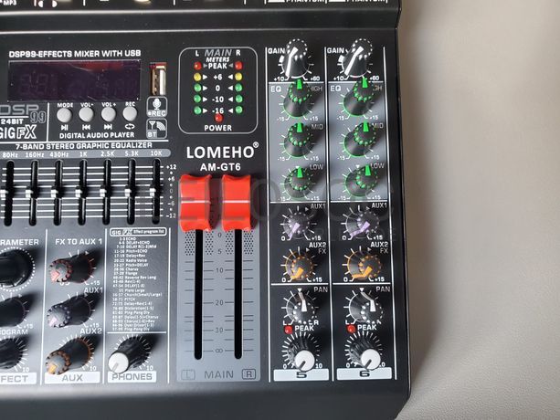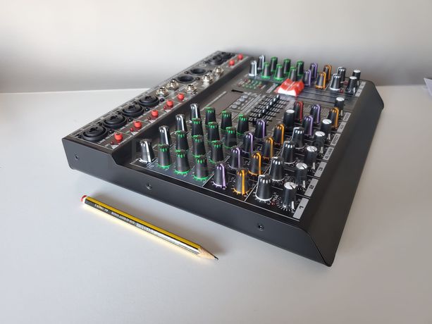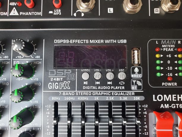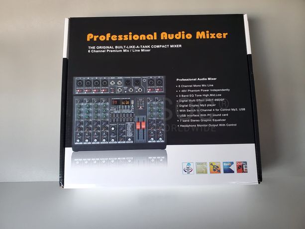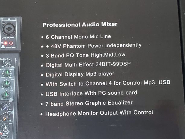 Mesa de mistura profissional de som de 6 canais, com USB, equalização, ganho individual, saída AUX, saíde de fones, duas saídas master, USB para leitor MP3, ligação Bluetooth, ligação USB para computador como placa de som.