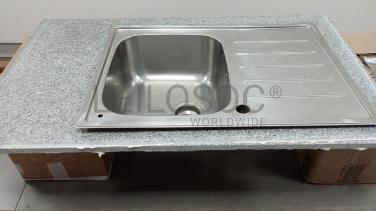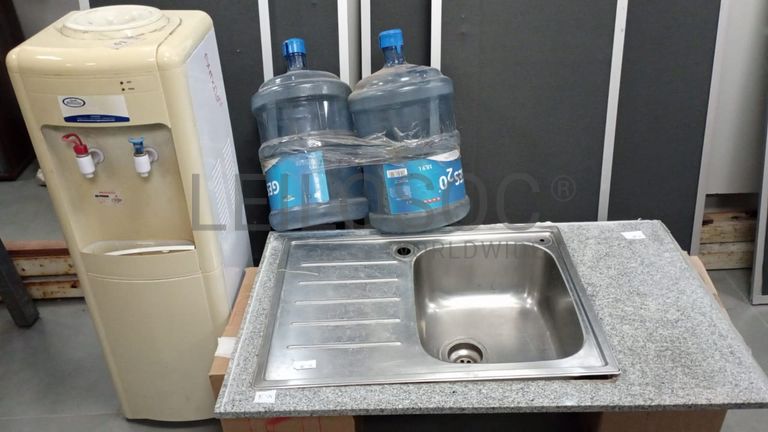 Uma lava louça e o respectivo mármore, dois galões de água, e um bebedouro não operacional