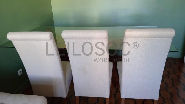 Uma mesa de jantar em vidro, três cadeiras .