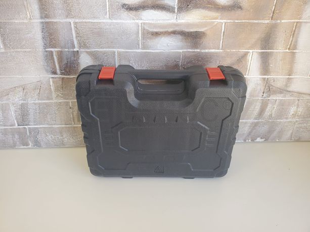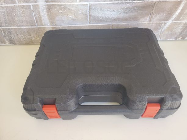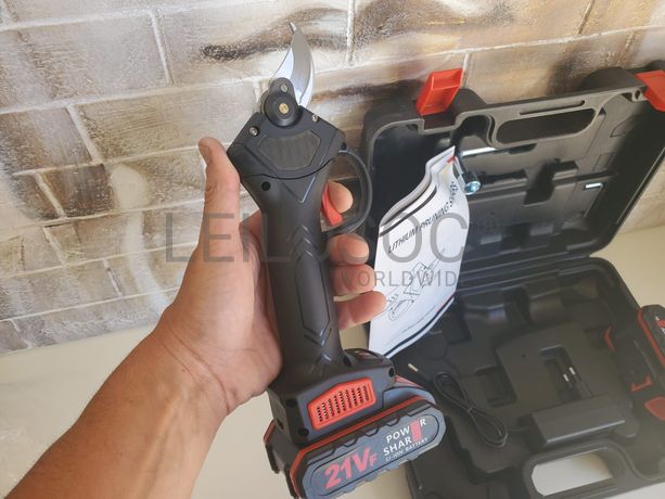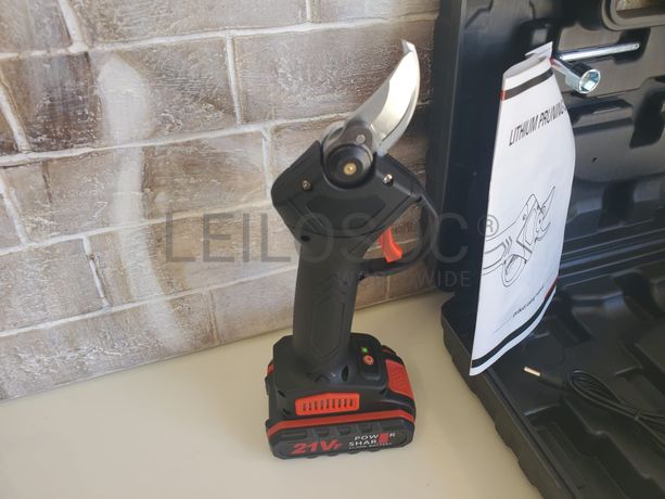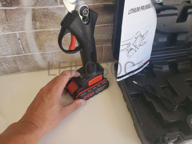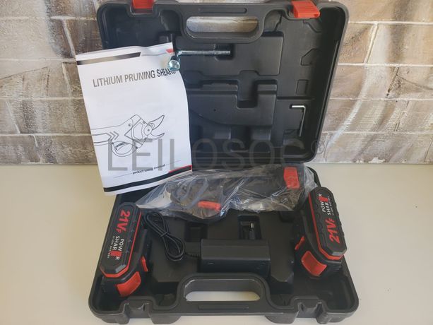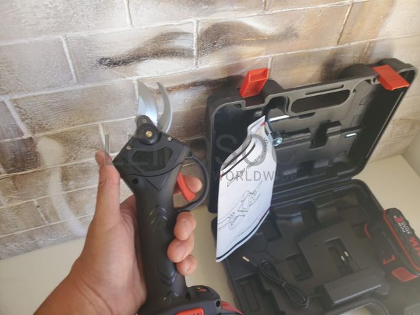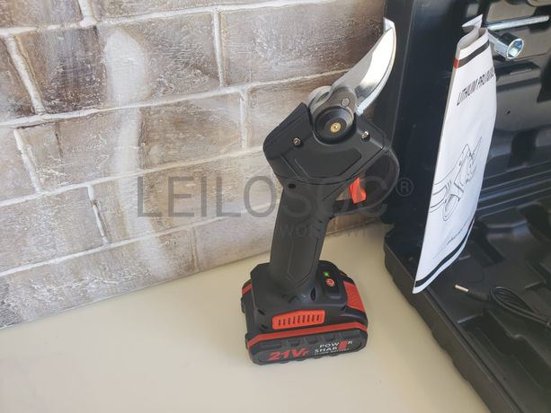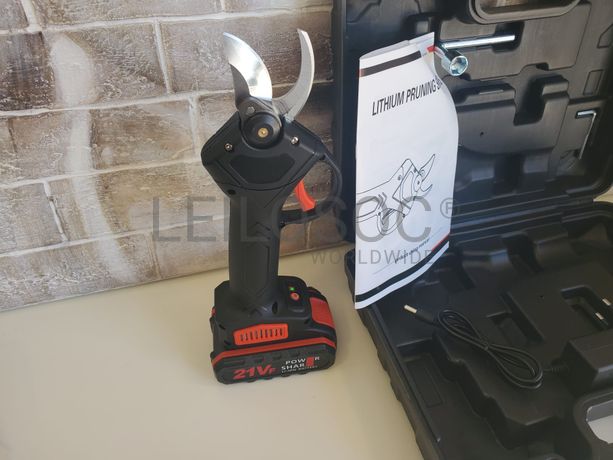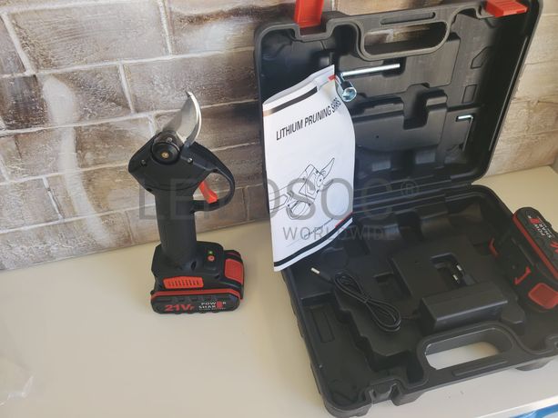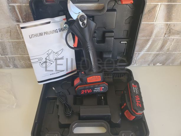 Tesoura de poda elétrica, com mala, carregador e duas baterias.