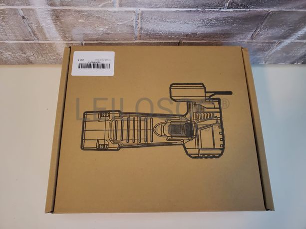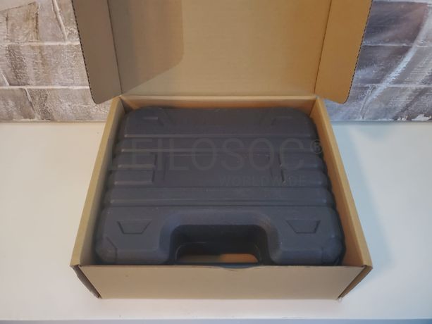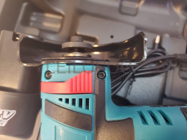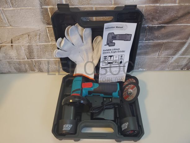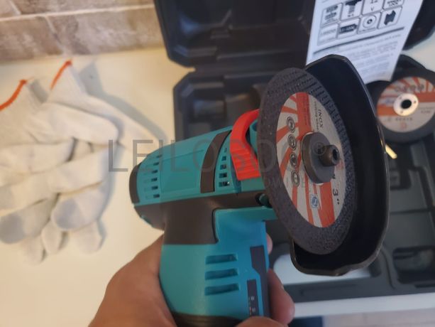 Mini rebarbadora angular, com dois discos de inox e metal, luvas, com caixa e duas baterias.