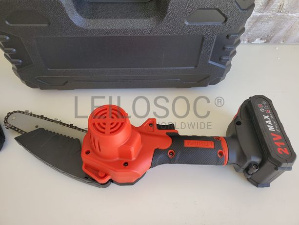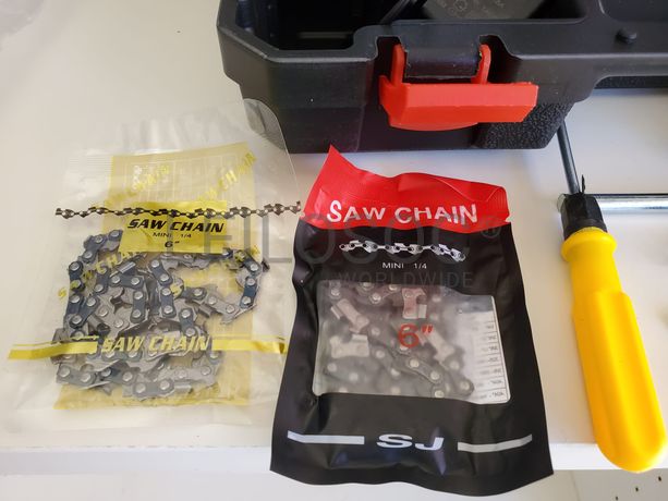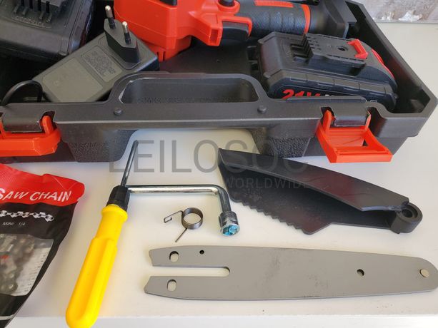 Motoserra elétrica com lâmina de 6 polegadas, com duas baterias incluídas, duas correntes de corte, carregador incluído e chaves como acessórios.