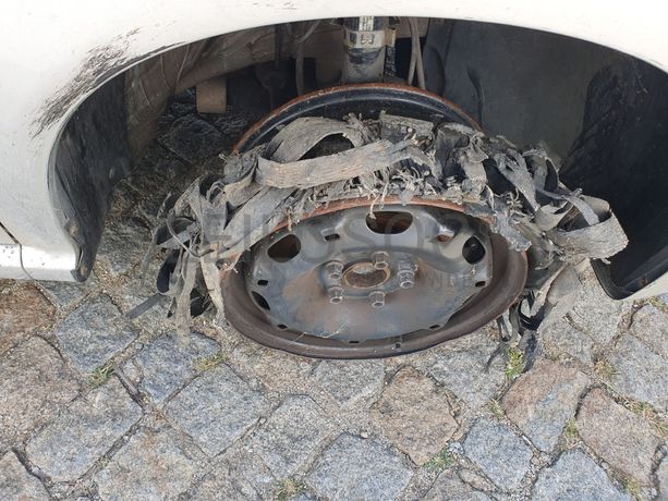 Danos visíveis: veículo não se encontra a funcionar, depósito de combustível furado, estofos sujos, alguns riscos, pára-choques da frente partido, pneu furado, pneu sobresselente danificado