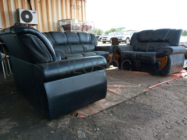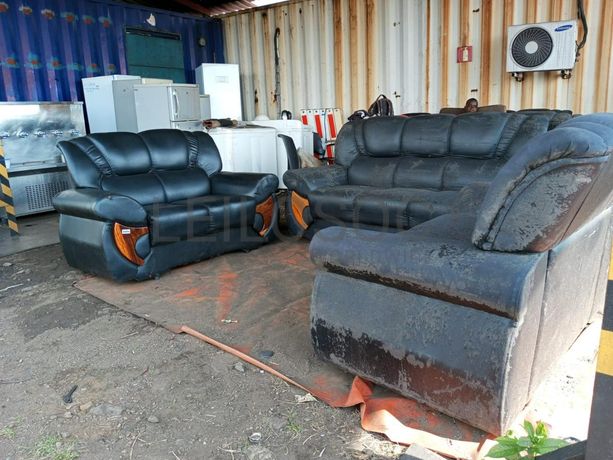 Um jogo de sofás com dois sofás de dois lugares e um de três lugares.