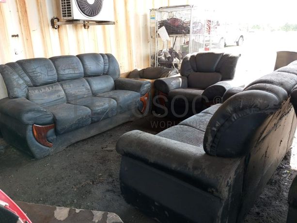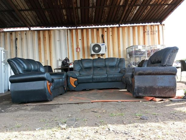 Um jogo de sofás de napa dois com três lugares e um de um lugar.