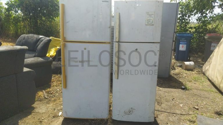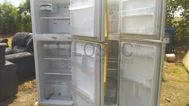 Uma geladeira de marca Samsung , uma geladeira de marca LG. Não operacionais