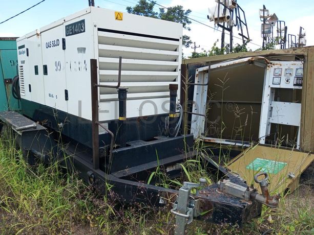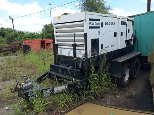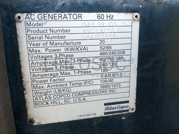 Gerador a diesel Atlas Copco modelo QAS58JDS. O número de série é USA021359 e foi fabricado em 2007. A potência nominal do gerador é de 65 kVA (52 kW). NOTA: Sujeito