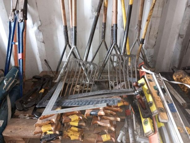 Dezanove níveis de pedreiro diversos, vinte serrotes, um plainer, dez ancinhos diversos, dois alicates grandes, sete armaduras de serrotes(folha de serra),seis esquadros.