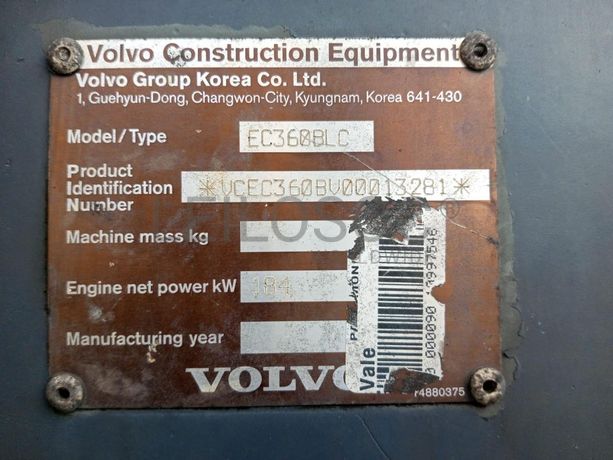 Uma escavadeira hidráulica marca Volvo, modelo EC360 BLC, SN : VCEC360BV00013490.