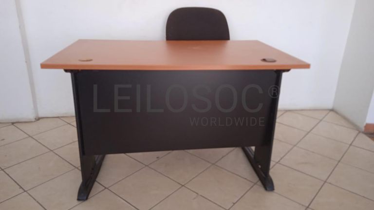Uma secretária e uma cadeira fixa.