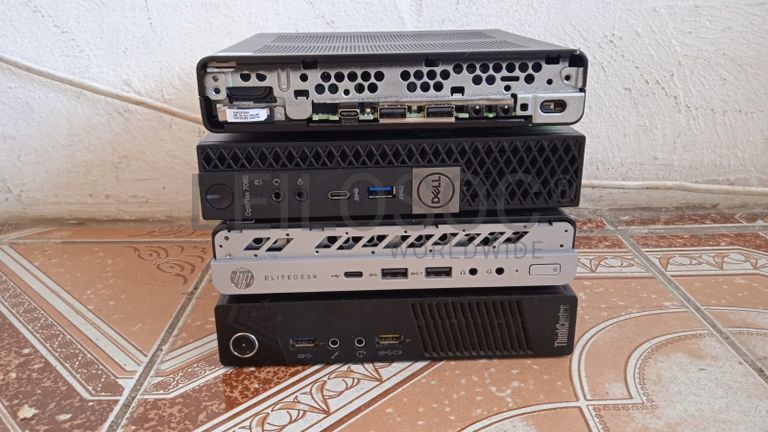 Quatro PCs mini, três marca dois HP litedesk um Core i7, um marca Dell e um marca Lenovo