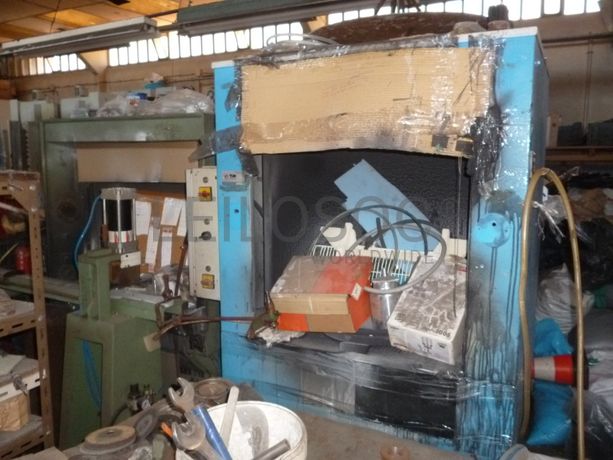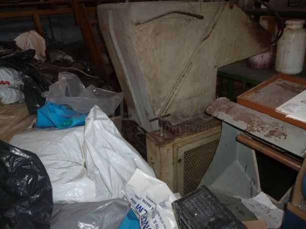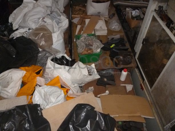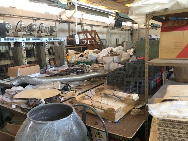 Frigorifico “PHILCO”, 3 estantes para moldes, 5 mesas de apoio, restos de matéria-prima/stocks